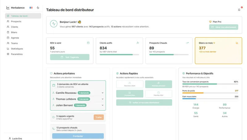 Herbalance est une solution innovante conçue pour les distributeurs Herbalife, visant à renforcer le suivi client et à optimiser la gestion nutritionnelle. Elle complète l'écosystème digital existant d'Herbalife en offrant des fonctionnalités avancées pour une relation client durable et des résultats objectivables.